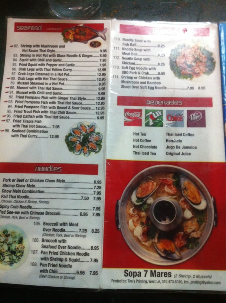 Introducing Thai Ocean, a hidden gem in the heart of Los Angeles, where authentic Thai cuisine shines in a casual and family-friendly atmosphere. Located at 747 S Vermont Ave, this inviting spot offers a diverse menu, with a particular spotlight on their renowned 7 Mares seafood soup. Guests rave about the rich flavors and generous portions, making it a must-try dish that brings friends and family together.